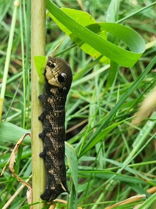 Momentan sind an Weidenröschen aber auch an Fuchsien regelmäßig Raupen des Mittleren Weinschwärmers zu finden. Die Raupe hat zur Abschreckung gegenüber Fressfeinden beidseitig Augenflecken ausgebildet. Sie erreicht eine Länge von 8 cm.